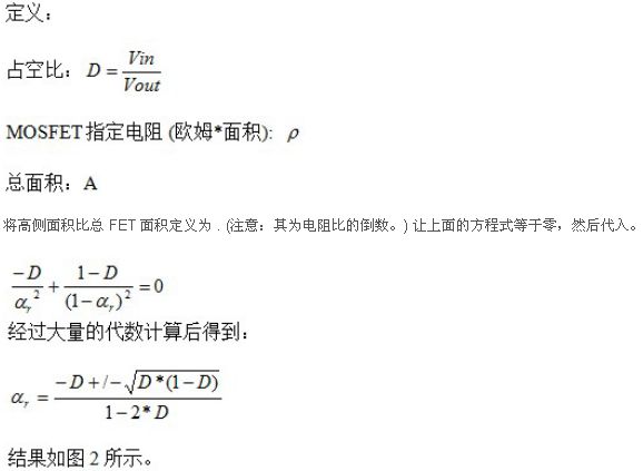 通過圖1,我們知道50%轉(zhuǎn)換比率時(shí)出現(xiàn)最佳傳導(dǎo)損耗極值。但是,在其他轉(zhuǎn)換比率條件下,可以將損耗降至這一水平以下。附錄給出了進(jìn)行這種優(yōu)化的數(shù)學(xué)計(jì)算方法,而圖2顯示了其計(jì)算結(jié)果。即使在極低的轉(zhuǎn)換比率條件下,F(xiàn)ET芯片面積的很大一部分都應(yīng)該用于高側(cè)FET。高轉(zhuǎn)換比率時(shí)同樣如此;應(yīng)該有很大一部分面積用于低側(cè)。這些結(jié)果是對這一問題的初步研究,其并未包括如高側(cè)和低側(cè)FET之間的各種具體電阻值,開關(guān)速度的影響,或者對這種芯片面積進(jìn)行封裝相關(guān)的成本和電阻等諸多方面。但是,它為確定FET之間的電阻比提供了一個良好的開端,并且應(yīng)會在FET選擇方面實(shí)現(xiàn)更好的整體折中。