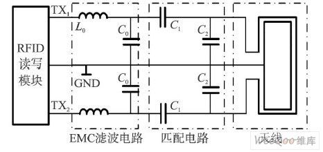 (1)電磁兼容( EMC)濾波(L0 , C0 )電路;(2)包含可調(diào)諧電容C1、C2 的匹配電路;(3)天線。