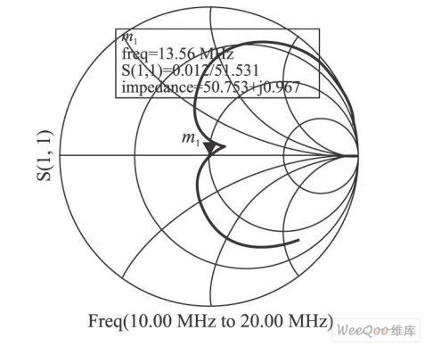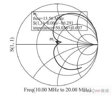 手動調(diào)諧即是交替不斷調(diào)整電容C1、C2 的值,同時觀察曲線變化,直到在所要求的頻率點S11等于0。圖2為某一天線電路在頻率在10~20MHz之間變化時,其反射系數(shù)的變化曲線,其中,標(biāo)記13. 56MHz的點, S11值近似為0,達到了匹配要求。