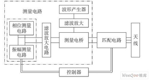 手工匹配采用的是阻抗分析儀或者網(wǎng)絡(luò)分析儀,網(wǎng)絡(luò)分析儀是用定向耦合器來測量天線電路的反射系數(shù)。但使用定向耦合器有幾個主要的缺點,例如功率損耗大和很難嵌入到IC芯片。故而本文在電路中不使用耦合器,從圖3看出,測量電路包含以下4部分。