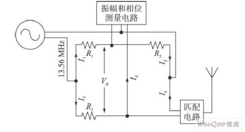 (1)測量電橋 用來測試天線的反射系數(shù)。主體部分為惠斯通電路,如圖4所示。其電路中的直流電源用波形產(chǎn)生器替代,用來生成13. 56 MHz的正弦載波信號。其中電阻R1、R2、R3 都為50 Ω。