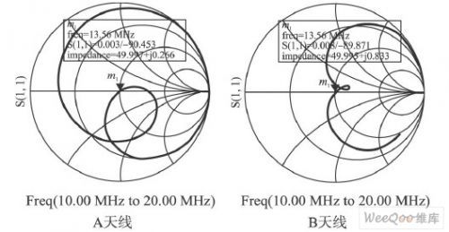 結(jié)果如圖7所示,對于A, B兩種天線的任何一種,都找到了最優(yōu)C1 和C2 的組合。當(dāng)頻率為13. 56MHz時,兩類天線的反射系數(shù)雖然與0點都有一定的偏差,但其偏差都在可接受范圍之內(nèi)。