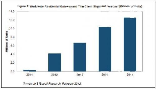 目前,住宅網(wǎng)關(guān)與充當接收器的瘦客戶box很少,但隨著有線及無線運營商開始推出提供更廣泛連接性與無縫接入的服務(wù),其數(shù)量將急劇增長。2012年,全球網(wǎng)關(guān)與瘦客戶box的出貨量將達到420萬個,而去年只有34.5萬個,2010年更是只有1000個。未來幾年其出貨量將繼續(xù)快速增長,到2013年達到680萬個,2014年上升到1040萬個,2015年達到1260萬個,如圖1所示。